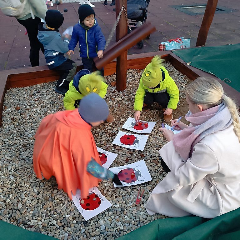 Akci jsme zahájili zábavnými aktivitami s úkoly na naší zahradě a poté jsme se společně vydali s lampióny přes náměstí do parku, kde na děti čekal teplý punč a perníková buchta. Závěr patřil společnému zpěvu Mravenčí ukolébavky, kterým jsme symbolicky broučky uspali.