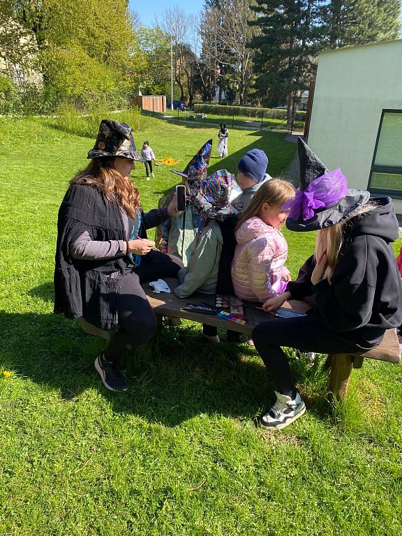Děti přišly v krásných čarodějnických kostýmech a společně jsme zahájili program čarodějnickým přivítáním a krátkým povídáním o tradici pálení čarodějnic. Následně děti plnily připravené zábavné úkoly rozmístěné po zahradě.